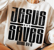 White sweatshirt with 'JESUS SAVES' text andbiblical reference on a person wearing it.