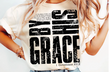 Text 'GROW GRACE' with floral designs on a white shirt.